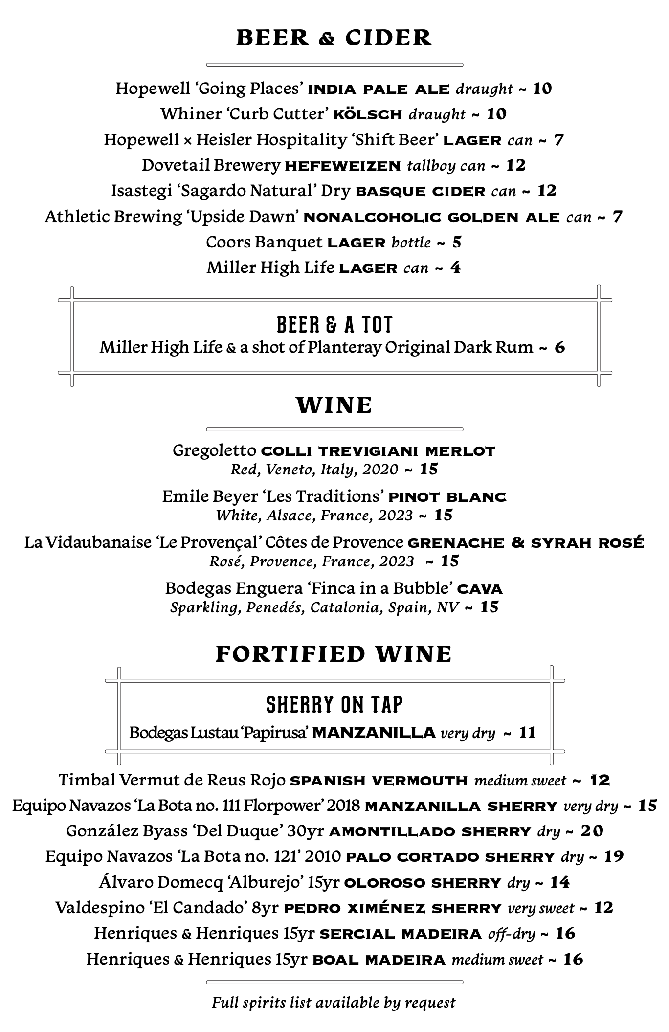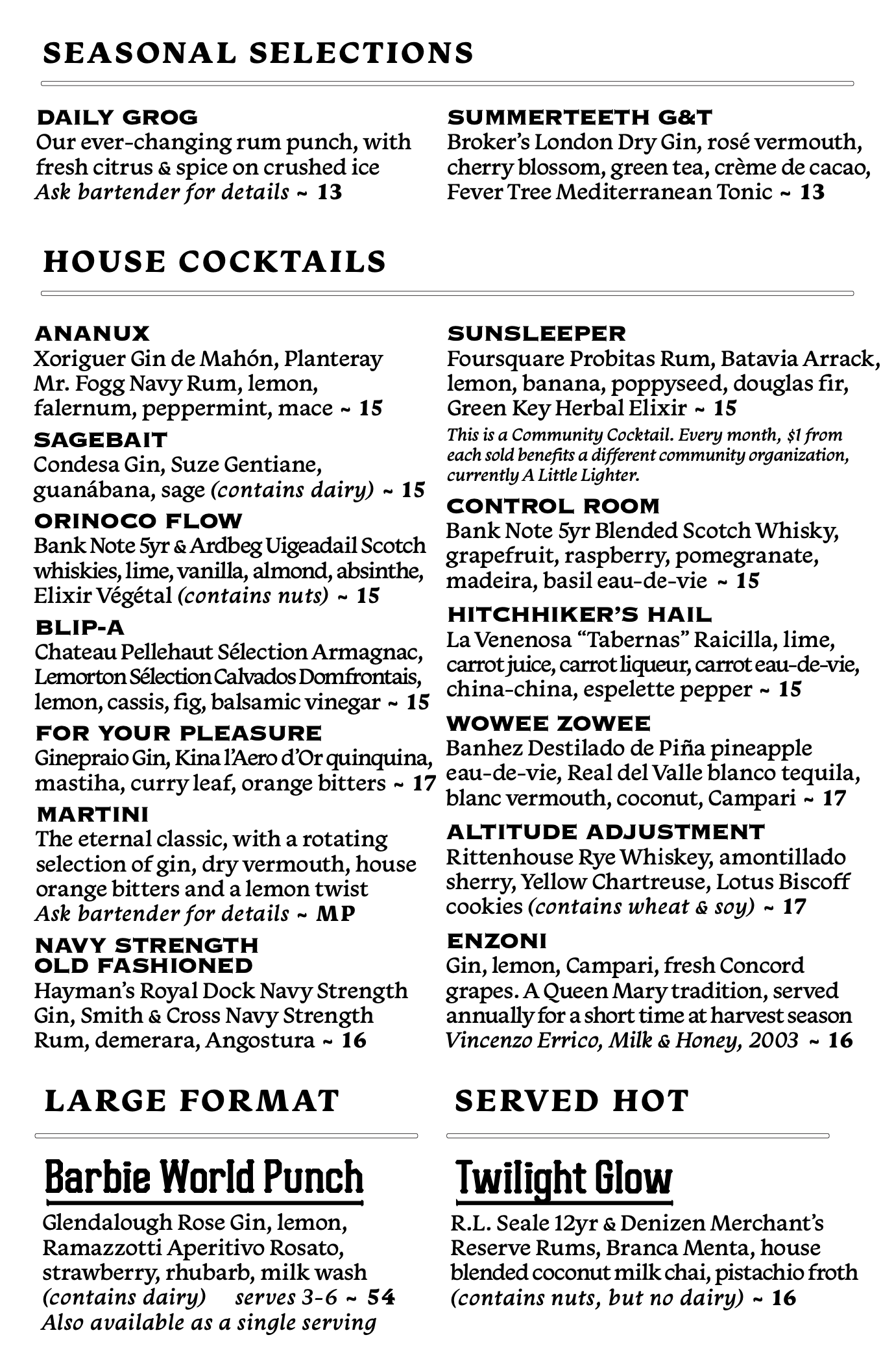 In addition to this menu, all classic cocktails and standard highballs are always available. Our bartenders are also always happy to create a custom cocktail to suit your taste. A full spirits list is available by request; we offer a fully stocked backbar covering all spirit categories, with a special focus on gin, rum and Scotch whisky.