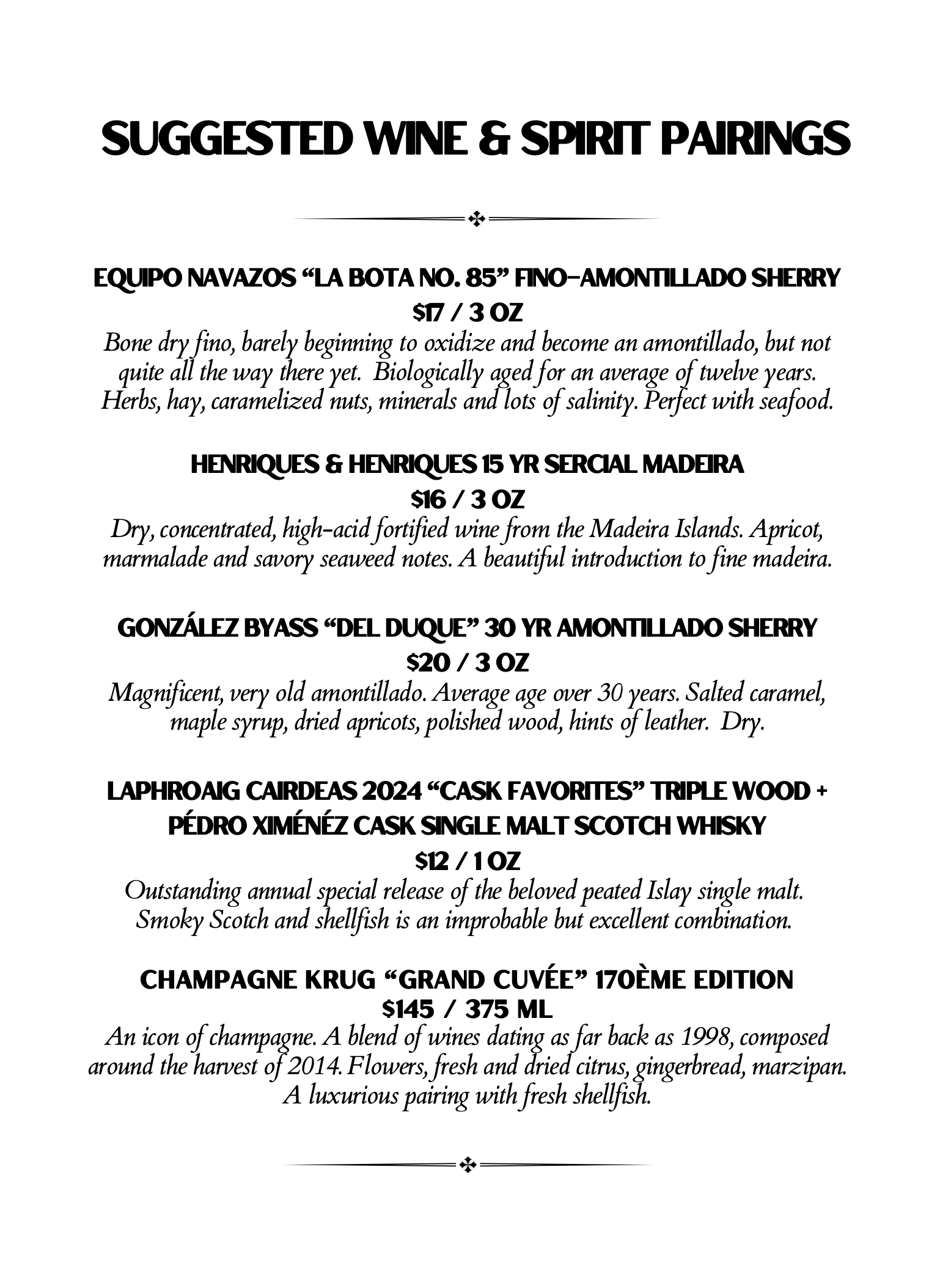 This menu is available during Raw Bar Happy Hour, every Sunday from 3pm – 7pm and every Monday from 5pm – 7pm.
